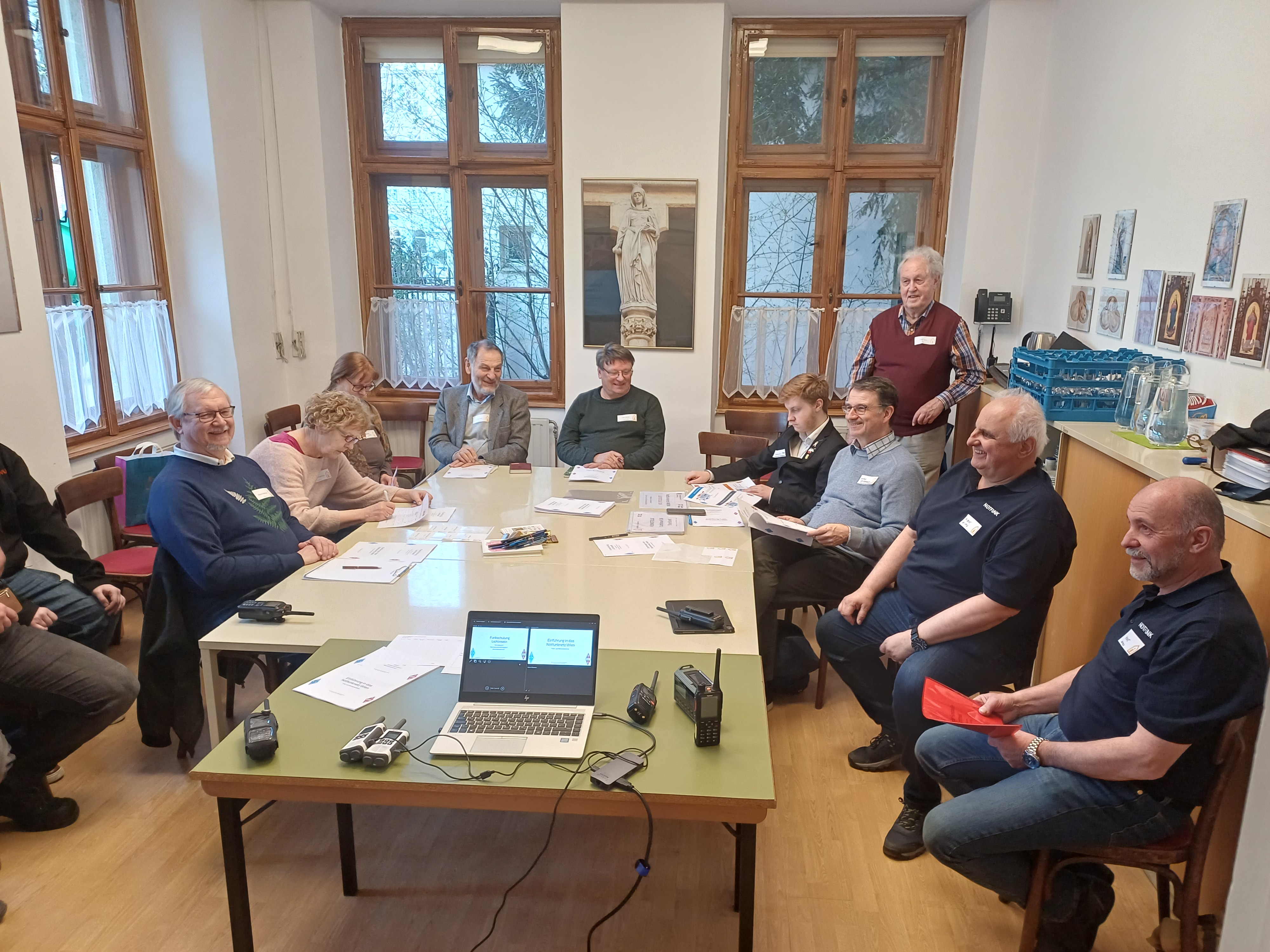 In der Lichtinsel St. Elisabeth im 4. Bezirk begrüßten wir neun Vertreter*innen aus vier bereits aktiven Lichtinseln, einer hoffentlich bald aktiven Lichtinsel und aus einem Pfarrverband in OE3. Nach einführenden Worten von Ulf Spies als Verantwortlicher der Lichtinsel St. Elisabeth und Eva-Maria Schmidbaur als Vertreterin der Erzdiözese Wien berichtete David Reinberger von der Magistratsdirektion - Organisation und Sicherheit von den aktuellen Entwicklungen des Krisenmanagements in Wien. Der eigentliche Kurs behandelte schwerpunktmäßig Organisation und Betrieb einer Lichtinsel. Im praktischen Teil wurden fingierte Notmeldungen über PMR abgewickelt. Geübt wurde Betriebstechnik und Dokumentation des Notfunkverkehrs auf Meldeformularen und Logbuch-Sheets..